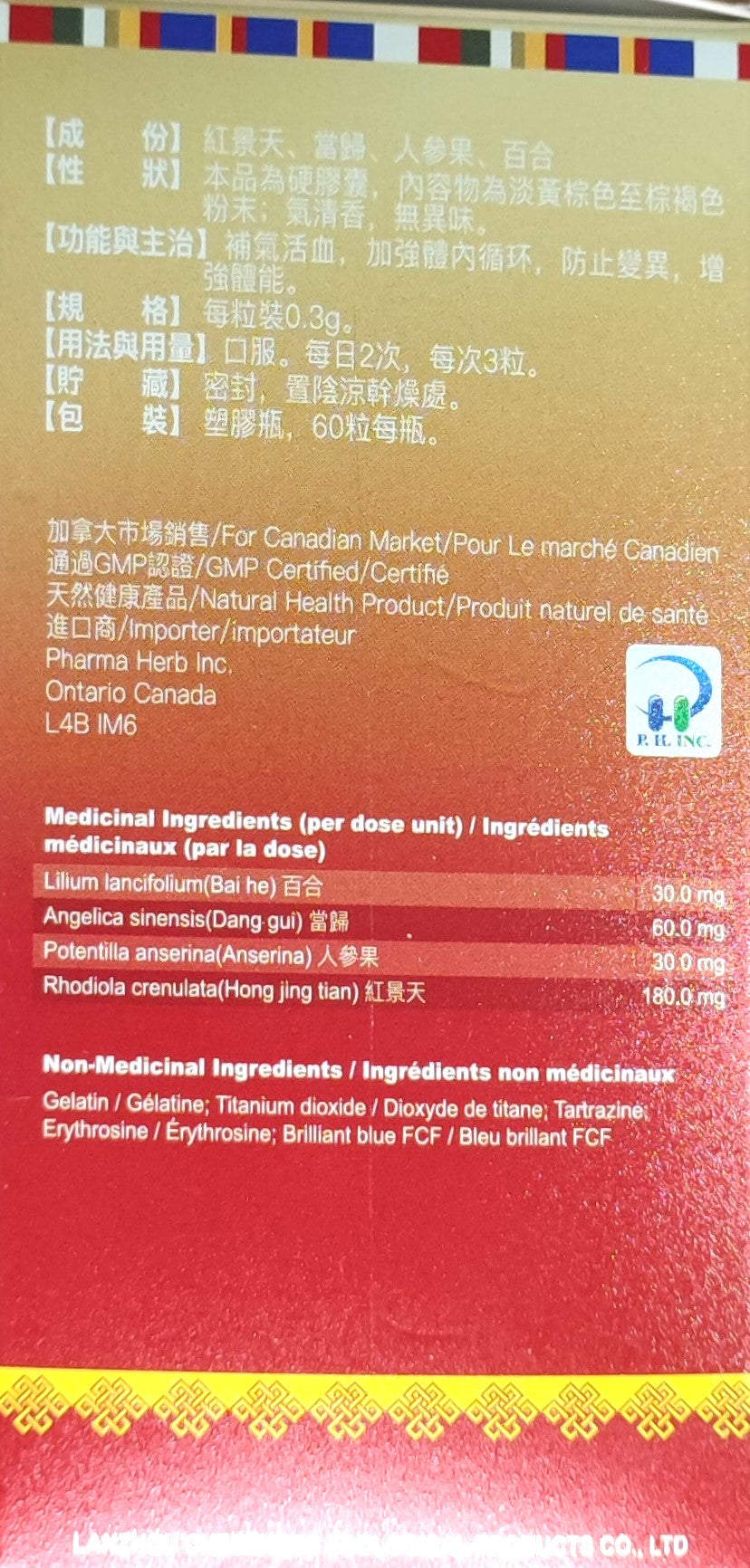 Ingredients and formulation from the Tibet highlands, a popular all-natural ingredient Traditional Chinese Medicine (TCM) used to benefit Qi and invigorate the Blood.  NPN 80113569. Concentrated formula, two times a day, 3 capsules each time. 60 capsules a box can last 20 days.