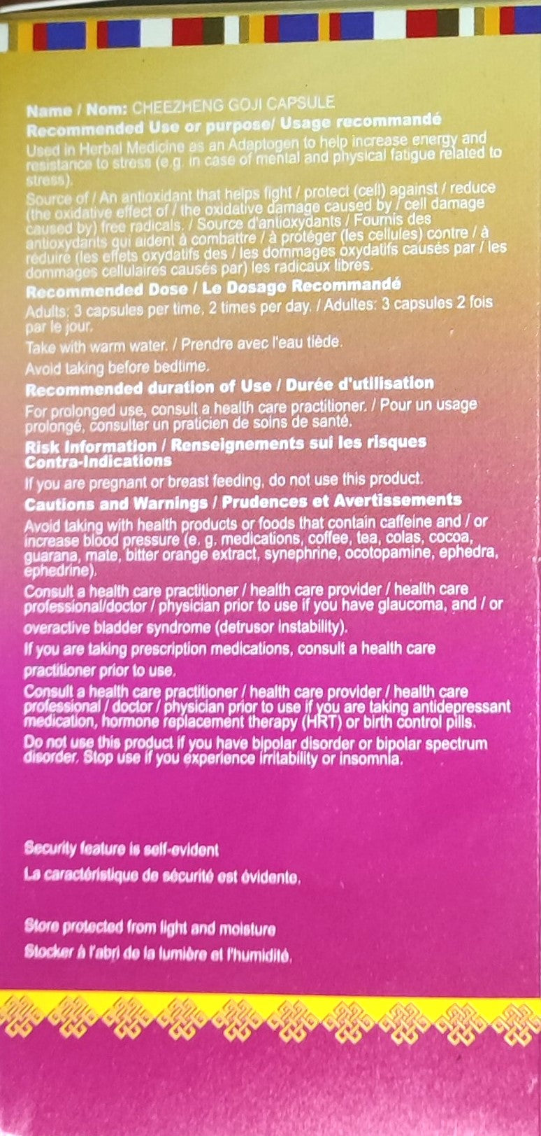 Ingredients and formulation from the Tibet highlands, a popular all-natural ingredient formulation used in Herbal Medicine as an Adaptogen to help increase energy and resistance to stress (e.g. in case of mental and physical fatigue related to stress). Source of/An antioxidant that helps (to): a) fight / b) protect (cells) against / c) reduce (the oxidative effect of/the oxidative damage caused by/cell damage caused by) free radicals.  NPN 80114336. Concentrated formula, twice a day, 3 capsules each time. 48 capsules a box can last 8 days.