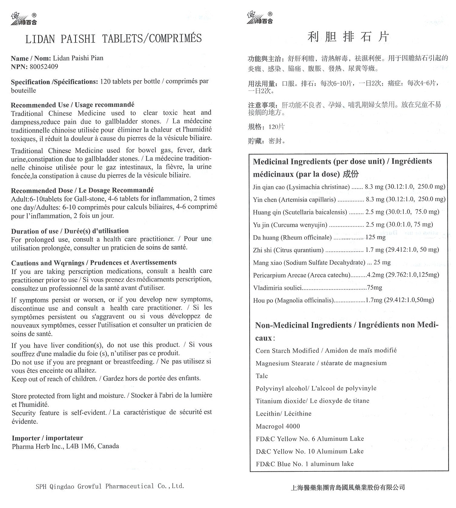 A popular all natural Traditional Chinese Medicine used to clear toxic heat and dampness, reduce pain due to gall bladder stones. Traditional Chinese Medicine used for bowel gas, fever, dark urine, constipation due to gall bladder stones. NPN 80052409. 120 tablets per bottle, each bottle may last 15 days. Manufactured by the original manufacturer in China SPH Qingdao Growful Pharmaceutical Co., Ltd.