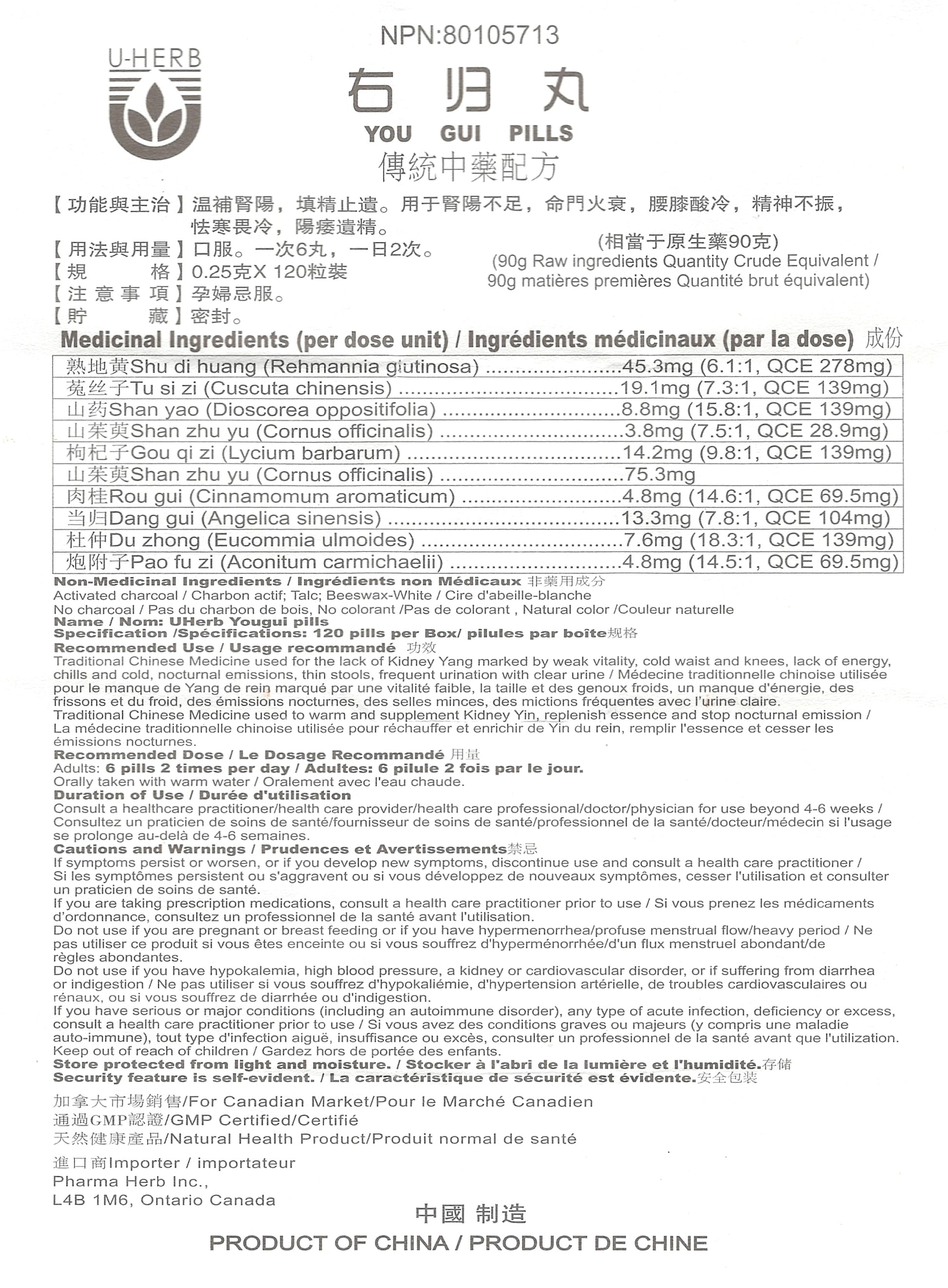 A popular all natural ingredients Traditional Chinese Medicine used for the lack of Kidney Yang marked by weak vitality, cold waist and knees, lack of energy, chills and cold, nocturnal emission, thin stools, frequent urination with clear urine. NPN 80105713. Super concentrated formula, two times a day, 6 pills each time. 120 pills a bottle can last 10 days .
