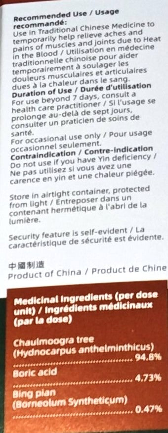 - Use in Traditional Chinese Medicine to temporarily help relieve aches and pains of muscles and joints due to Heat in the Blood / Utilisation en médecine traditionnelle chinoise pour aider temporairement à soulager les douleurs musculaires et articulaires dues à la chaleur dans le sang. 祛风除湿,润肤止痒。用于血燥风湿,红肿疙瘩,雀斑粉刺,酒糟鼻子,风湿疥癣,鹅掌风。